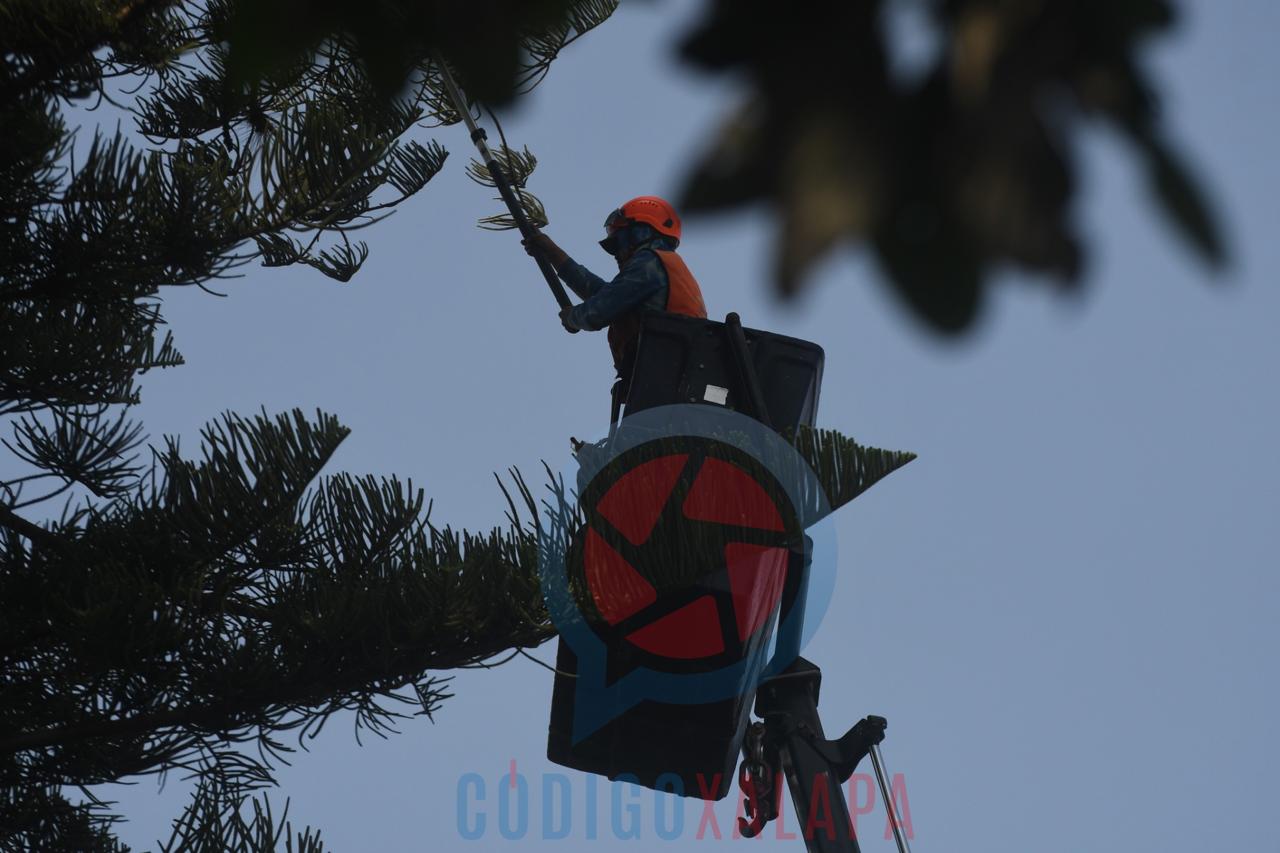Personal de Protección Civil Municipal de Xalapa realizó acciones preventivas en el parque Benito Juárez para evitar accidentes, luego de las fuertes rachas de viento registradas este jueves en la capital veracruzana.