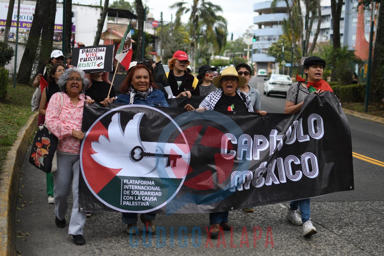 Entre consignas como “Palestina, escucha, Veracruz está en tu lucha”, los participantes recorrieron el centro de la ciudad para exigir atención internacional al conflicto.