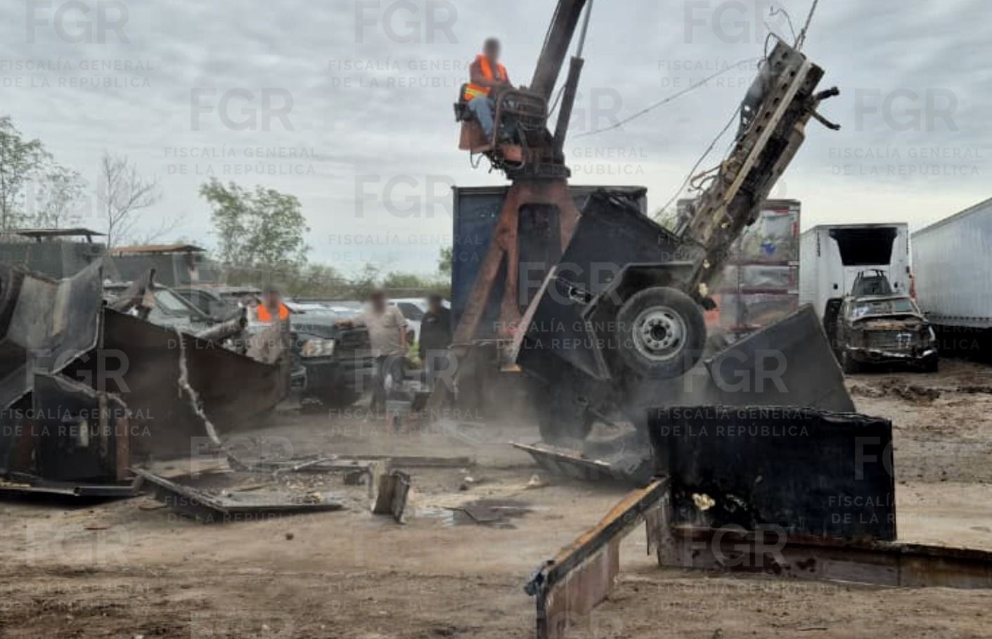 La Fiscalía General de la República informó sobre la destrucción de 18 vehículos con blindaje artesanal, conocidos como “monstruos”, asegurados en operativos contra el crimen organizado en Tamaulipas y vinculado a 16 carpetas de investigación.