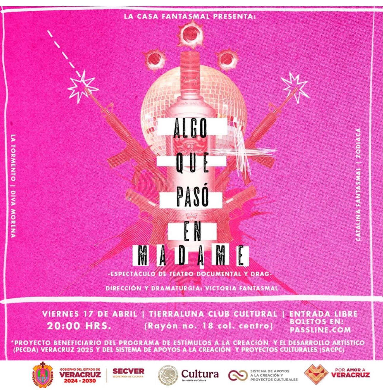 Xalapa, Ver.- Victoria Fantasmal, junto a sus compañeras drags integrantes del colectivo “La Casa Fantasmal”, presentarán su más reciente proyecto: “Algo que pasó en Madame”, un espectáculo que fusiona el rigor del teatro documental con la expresividad del Show Drag, función que se llevará a cabo en el escenario de Tierra Luna Club Cultural este viernes 17 de abril, en punto de las 20:00 horas.