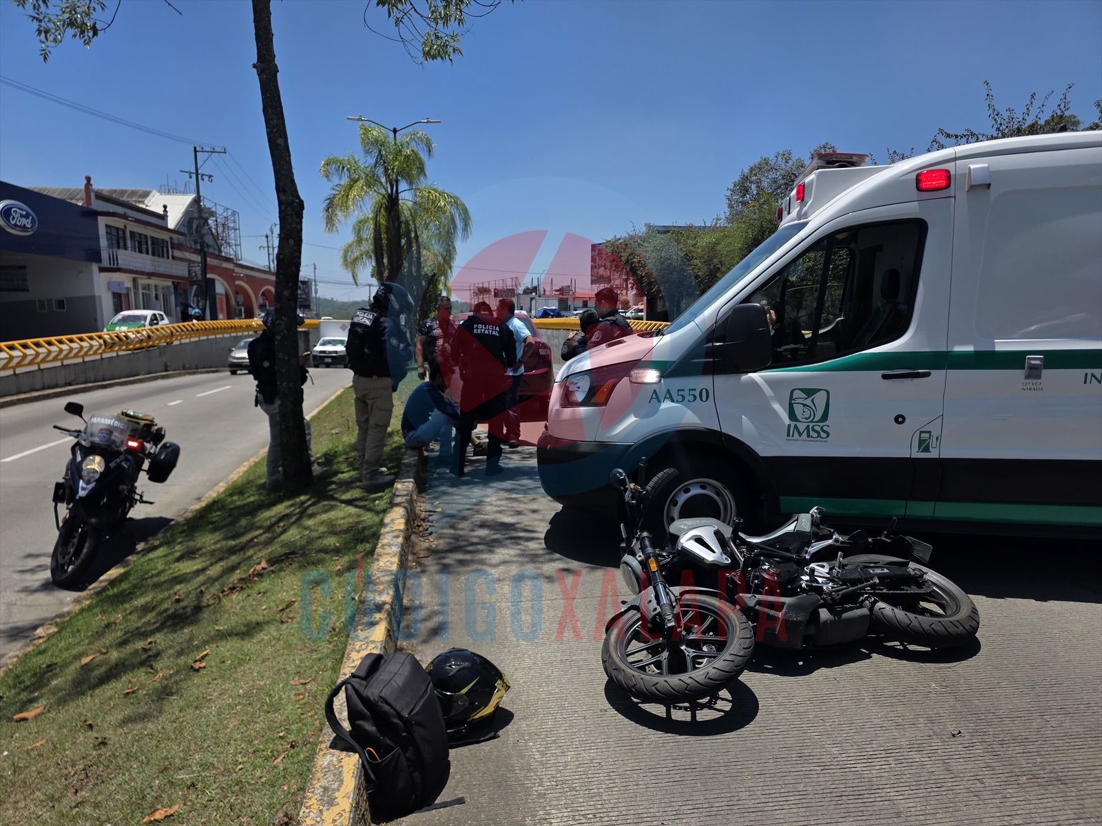 Xalapa, Ver., 28 de abril de 2026.— Un motociclista colisionó contra una ambulancia del Instituto Mexicano del Seguro Social (IMSS) cuando esta realizaba maniobras para estacionarse y recoger a un paciente en una clínica ubicada sobre la avenida Maestros Veracruzanos, antes de llegar a 20 de Noviembre, a la altura de la agencia Ford.