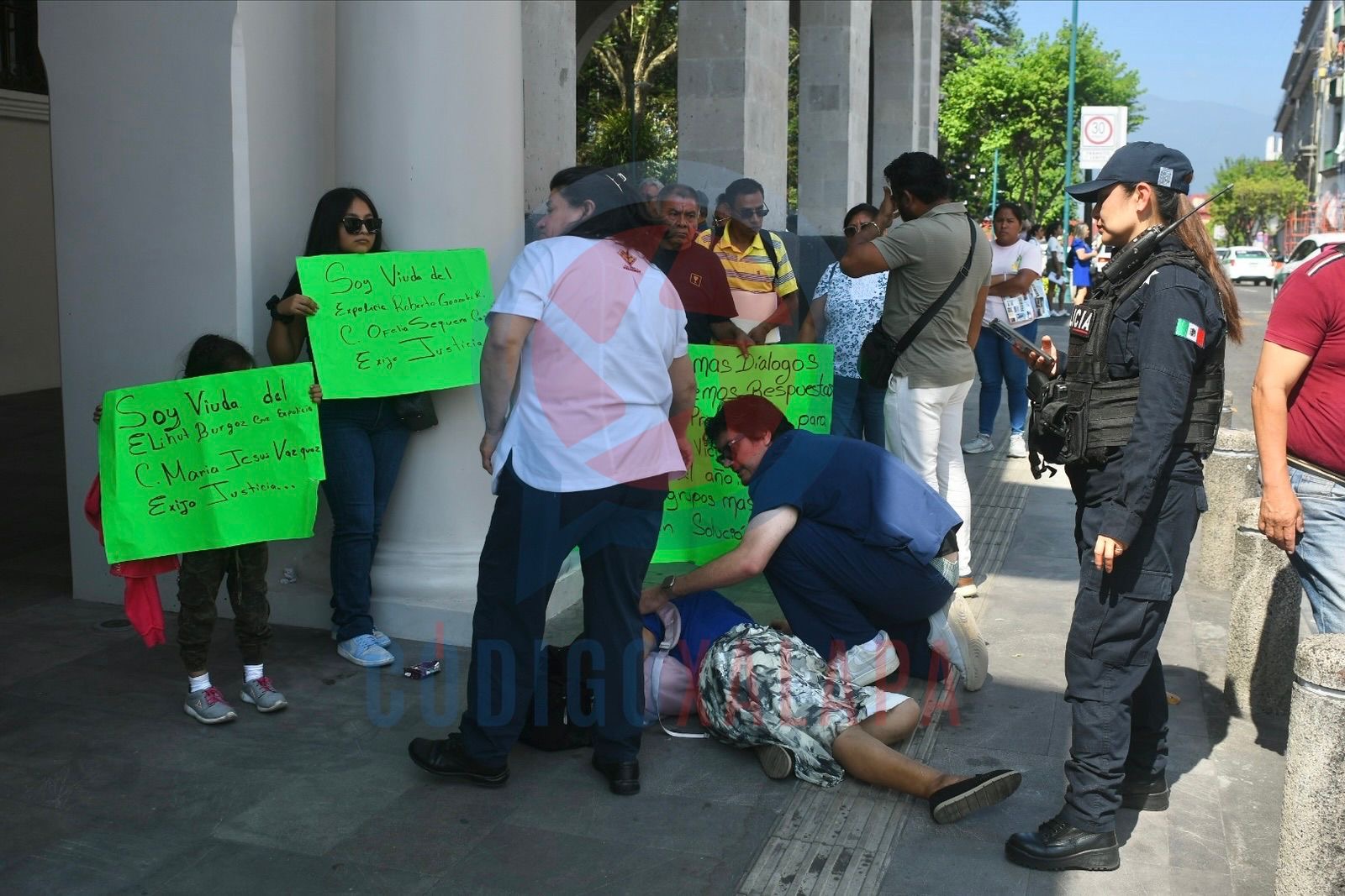 Durante la protesta, una mujer de aproximadamente 70 años madre de un ex policía caído se desmayó en los bajos de Palacio de Gobierno, donde fue atendida por paramédicos, presuntamente a causa de las altas temperaturas y el tiempo prolongado bajo el sol.